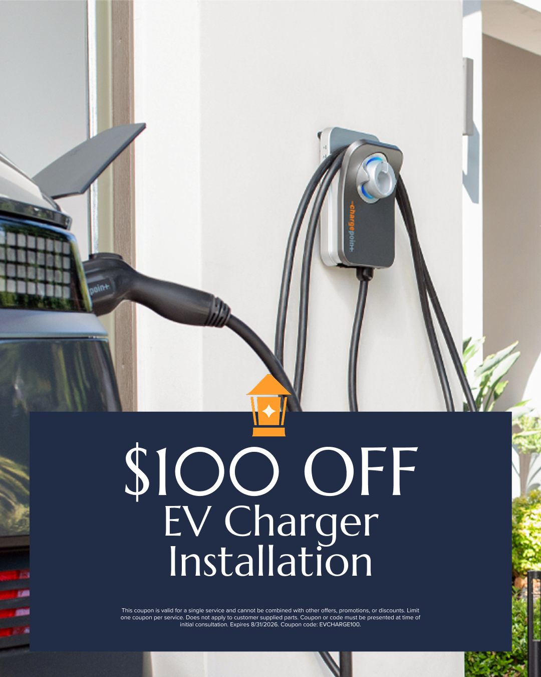 This coupon is valid for a single service and cannot be combined with other offers, promotions, or discounts. Limit one coupon per service. Does not apply to customer supplied parts. Coupon or code must be presented at time of initial consultation. Expires 8/31/2026. Coupon code: EVCHARGE100.